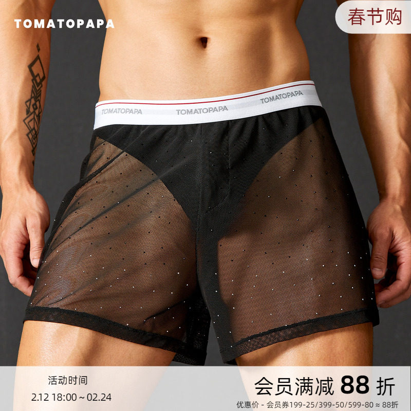 TOMATOPAPA Men's Lace Sexy Sheer Mesh Aro Pants Diamond Embellished Mid-Rise Loose Boxer Briefs