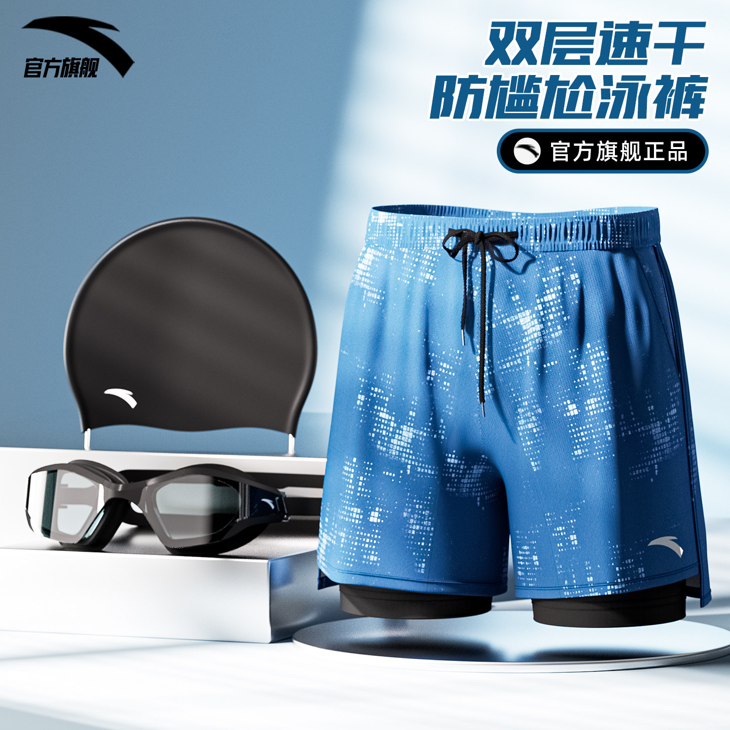 ANTA men's swimming trunks swimming goggles swim cap three-piece set double-layer five-point adult sunscreen beach swimming trunks quick-drying new model