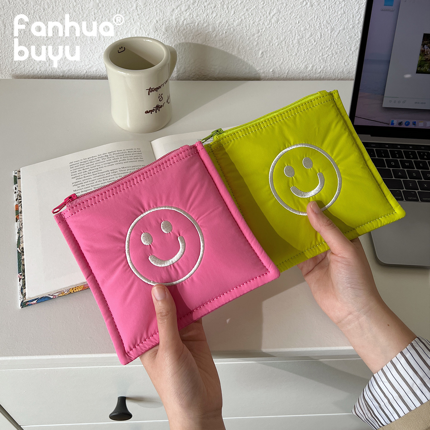 Fan Hua silently cute mini makeup bag female portable fabric coin purse aunt towel storage bag smiling face clutch