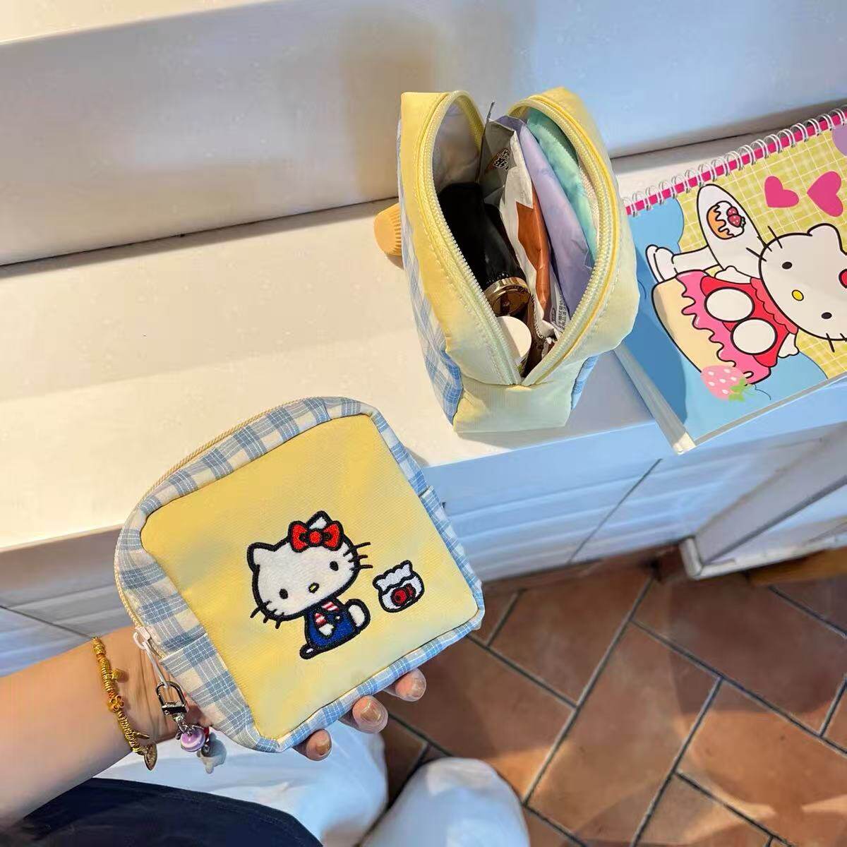 Original new embroidery kitty cosmetic bag color blocking cute cartoon small square bag aunt towel miscellaneous liner bag