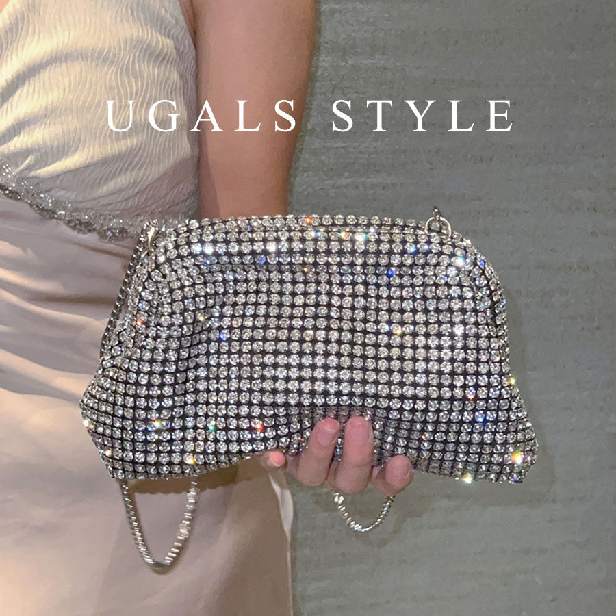 UGALS shiny rhinestone clip pleated cloud bag banquet diamond dumplings handheld crossbody small bag bag girl