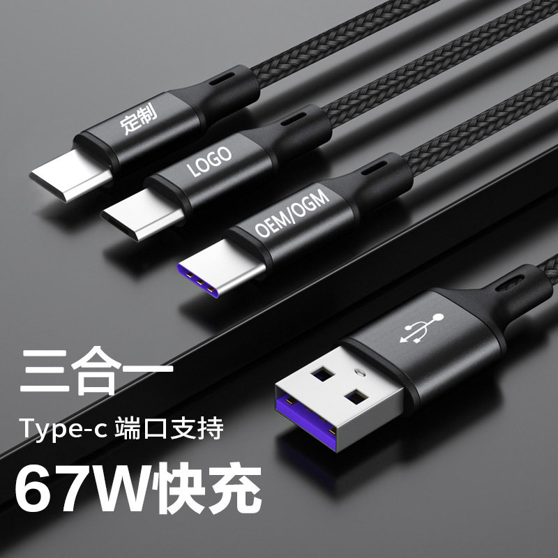 67W 3-in-1 data cable, 1-to-3 charging cable, typec for Apple, Huawei, super fast charging Android cable