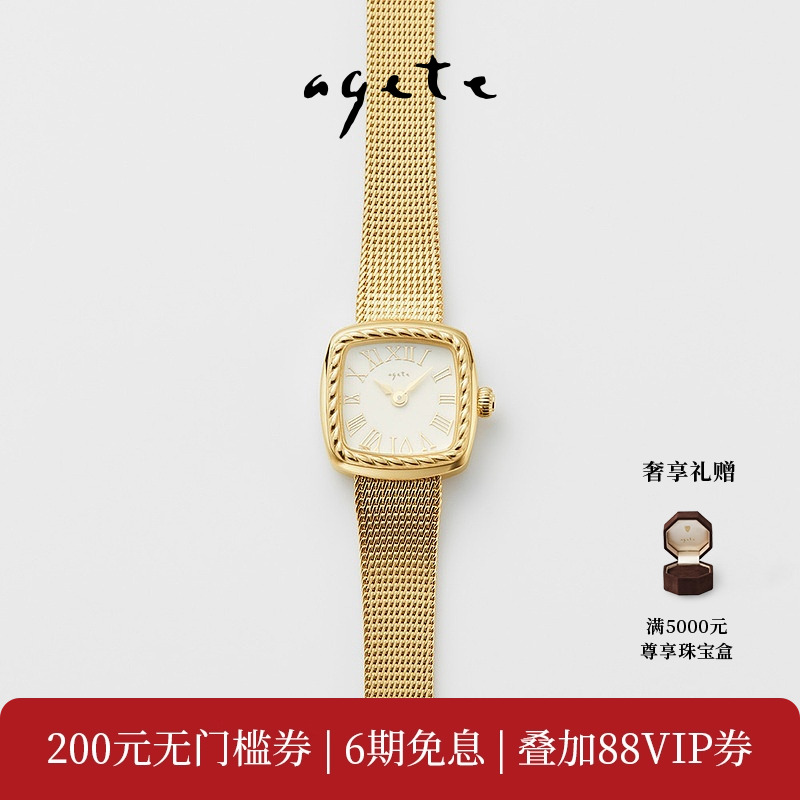agete/Akado [small gold watch] champagne gold elegant retro small square watch occupation