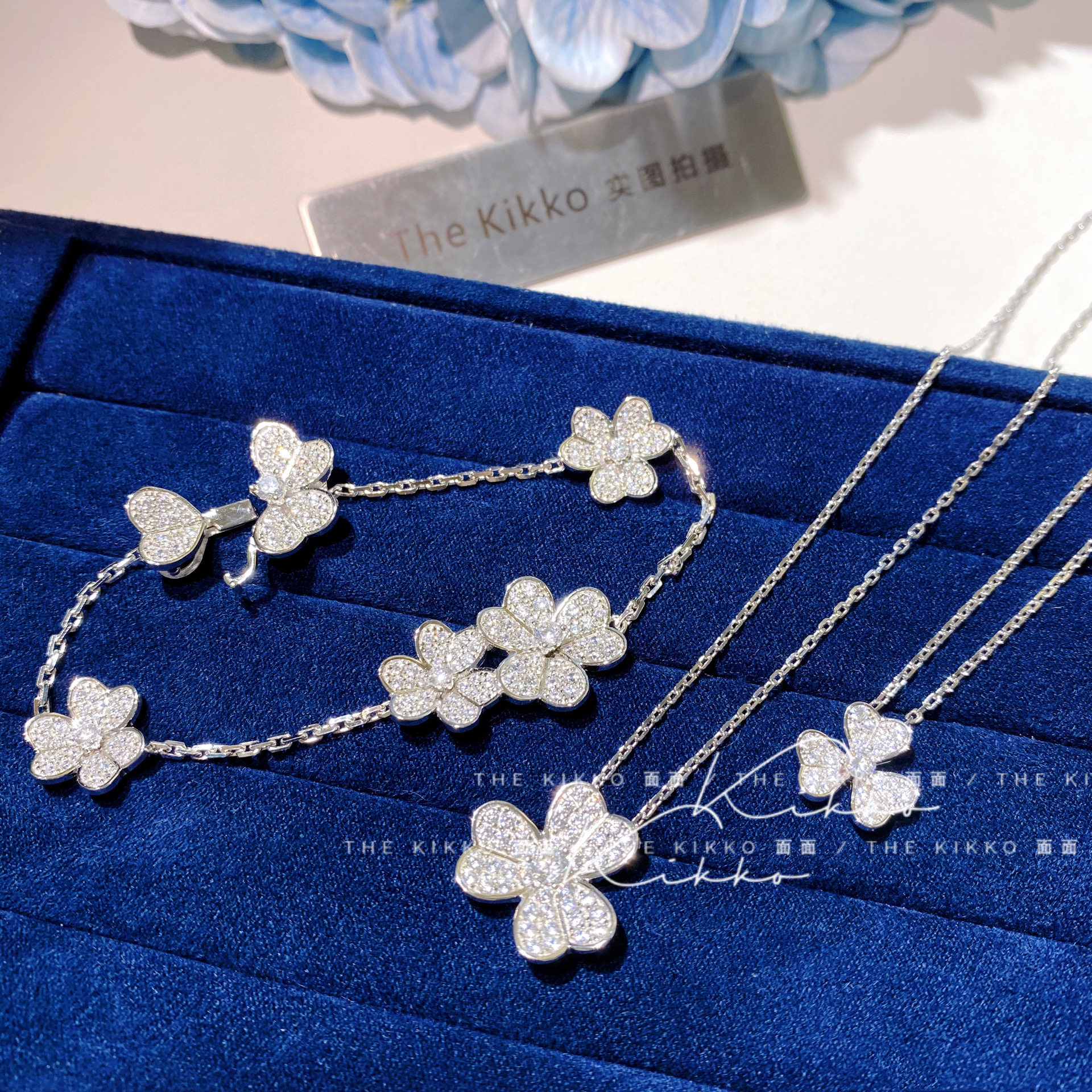Haute couture floral sterling silver 925 silver plated 18K gold niche clover petals full of diamond collarbone chain necklace bracelet