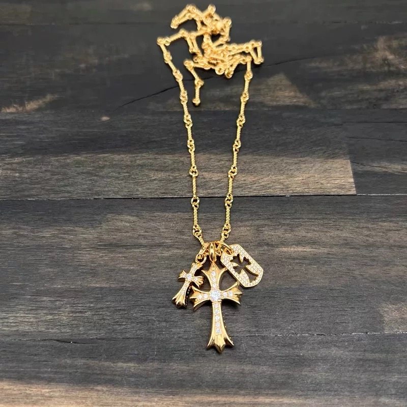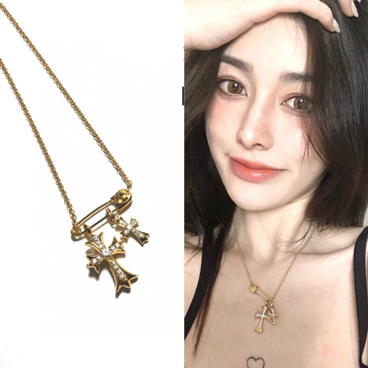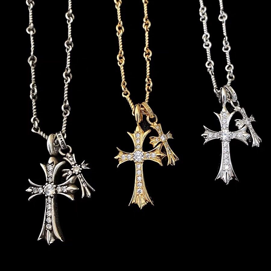 Sterling silver double cross necklace gold-plated and diamond-encrusted Yi Mengling is the same trendy punk style men's and women's collarbone chain sweater chain