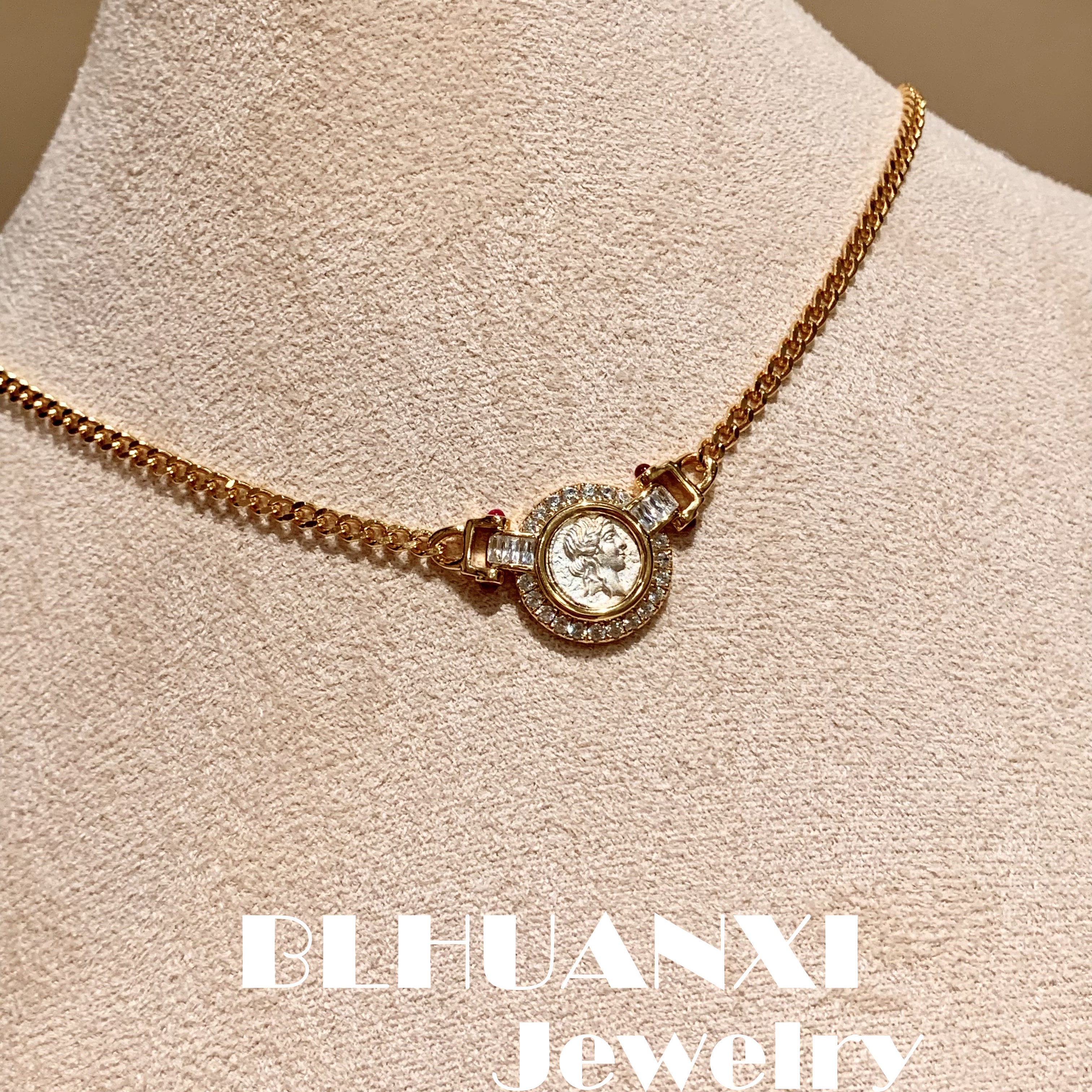 [Look for joy] 925 silver gilded water marsh fairy double-sided ancient coin Cuban chain choker