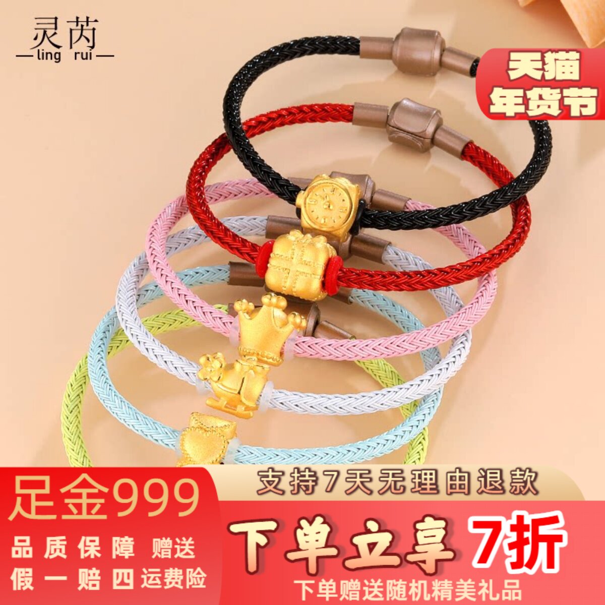 999 Foot Gold Peach Blossom Bracelet Women's Gold Bow Clover Transfer Bead 3D Hard Gold Love Crown Beading