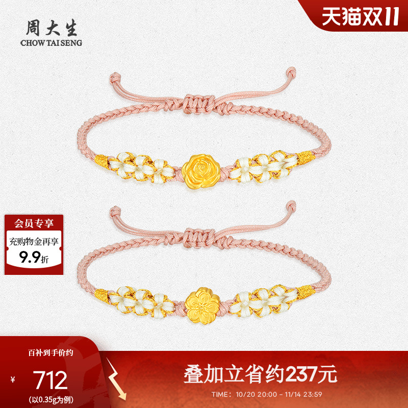 Chow Tai Sheng's gold transfer beads, women's football gold hard gold beaded rose peach blossom braided rope bracelet for girlfriend's birthday