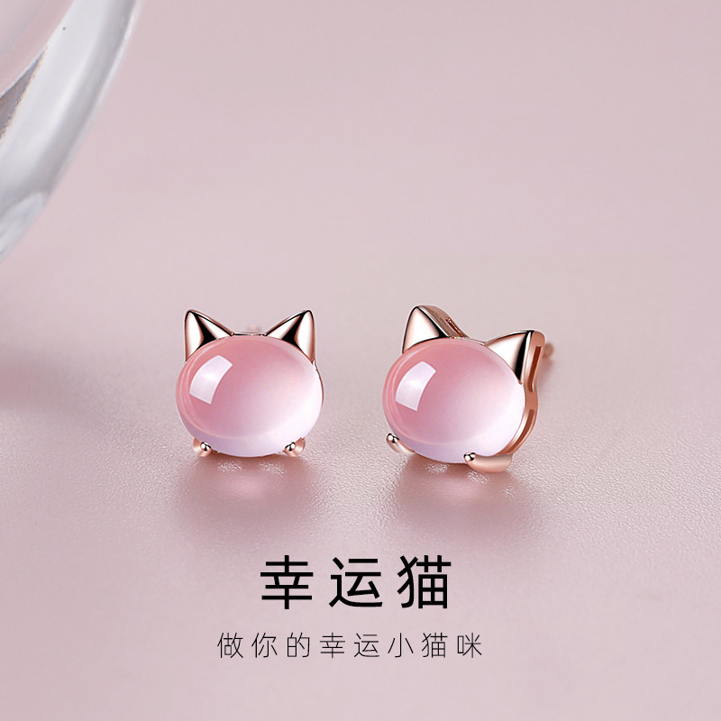 New 999 foot silver cat stud earrings for women simple and versatile pink crystal earrings spring and summer trend student children's earrings for women