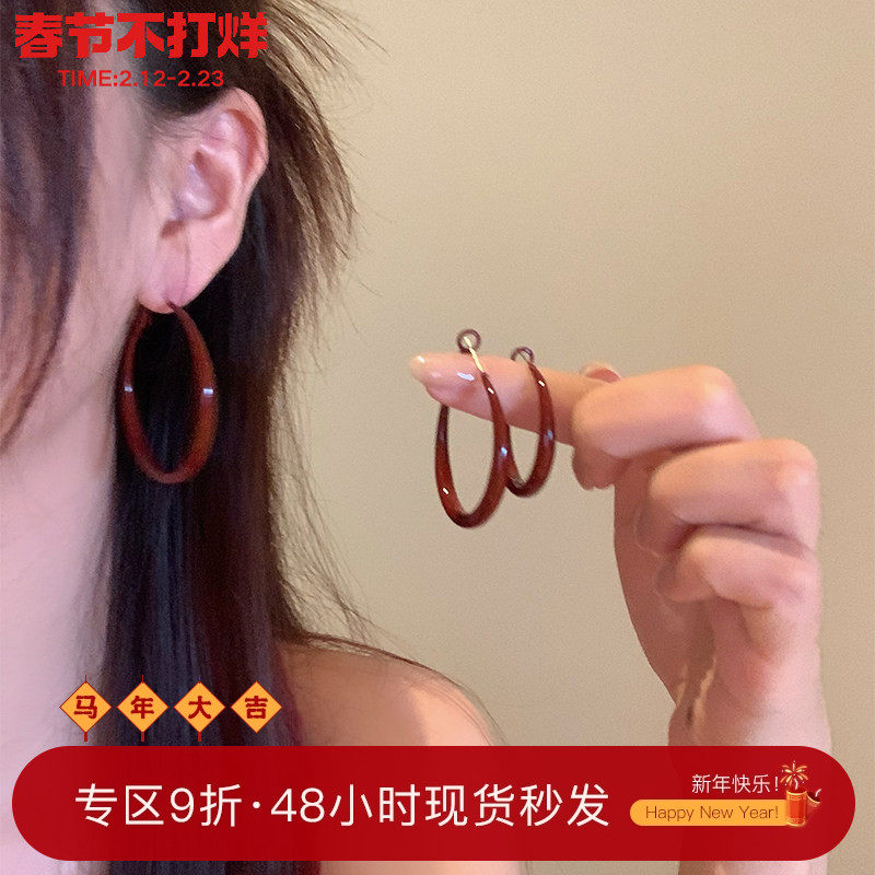 Retro Hong Kong style red drip oil earrings circles plain ring earrings women's high-end stud earrings feminine temperament earrings buckle earrings