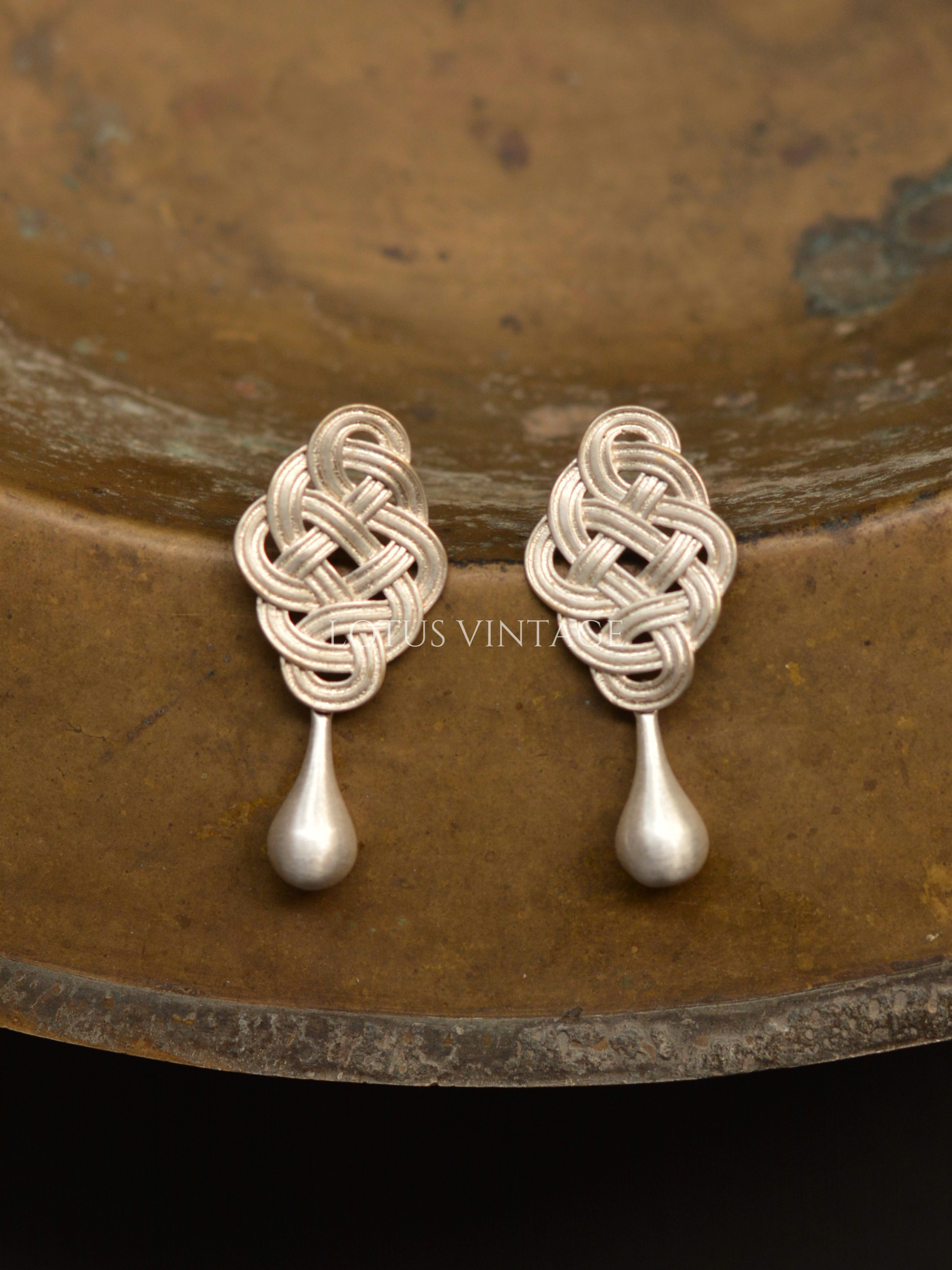 LOTUS VINTAGE Chinese Yi handmade old silver plated silver knot buckle vintage water drop earrings