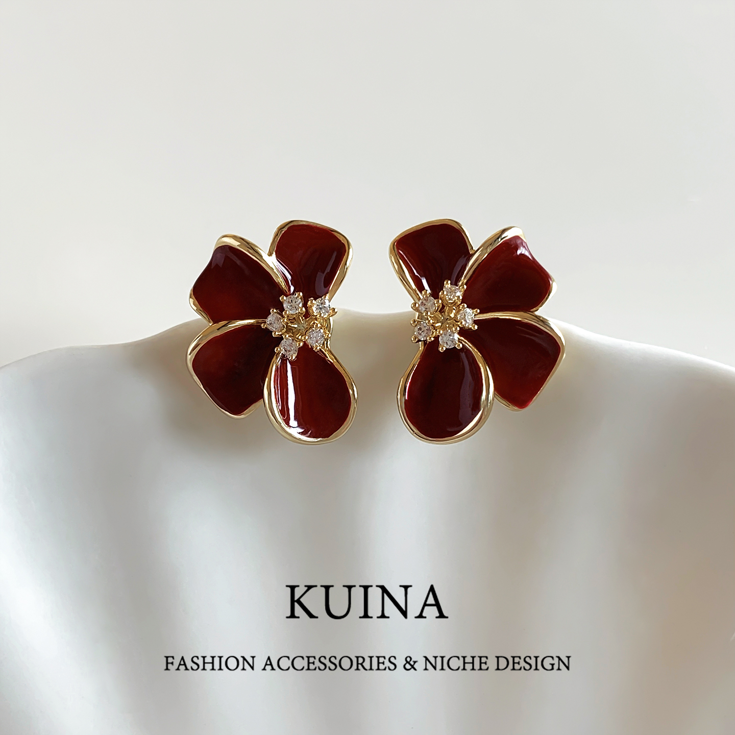 Red enamel flower stud earrings, women's light luxury temperament, high-end sterling silver needle earrings, niche unique and beautiful earrings