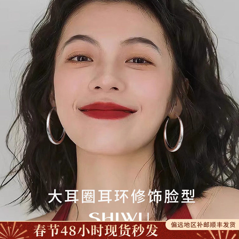 999 sterling silver earrings, large rings, autumn and winter red earrings, women's earrings, high-end light luxury and plain ring ear clips