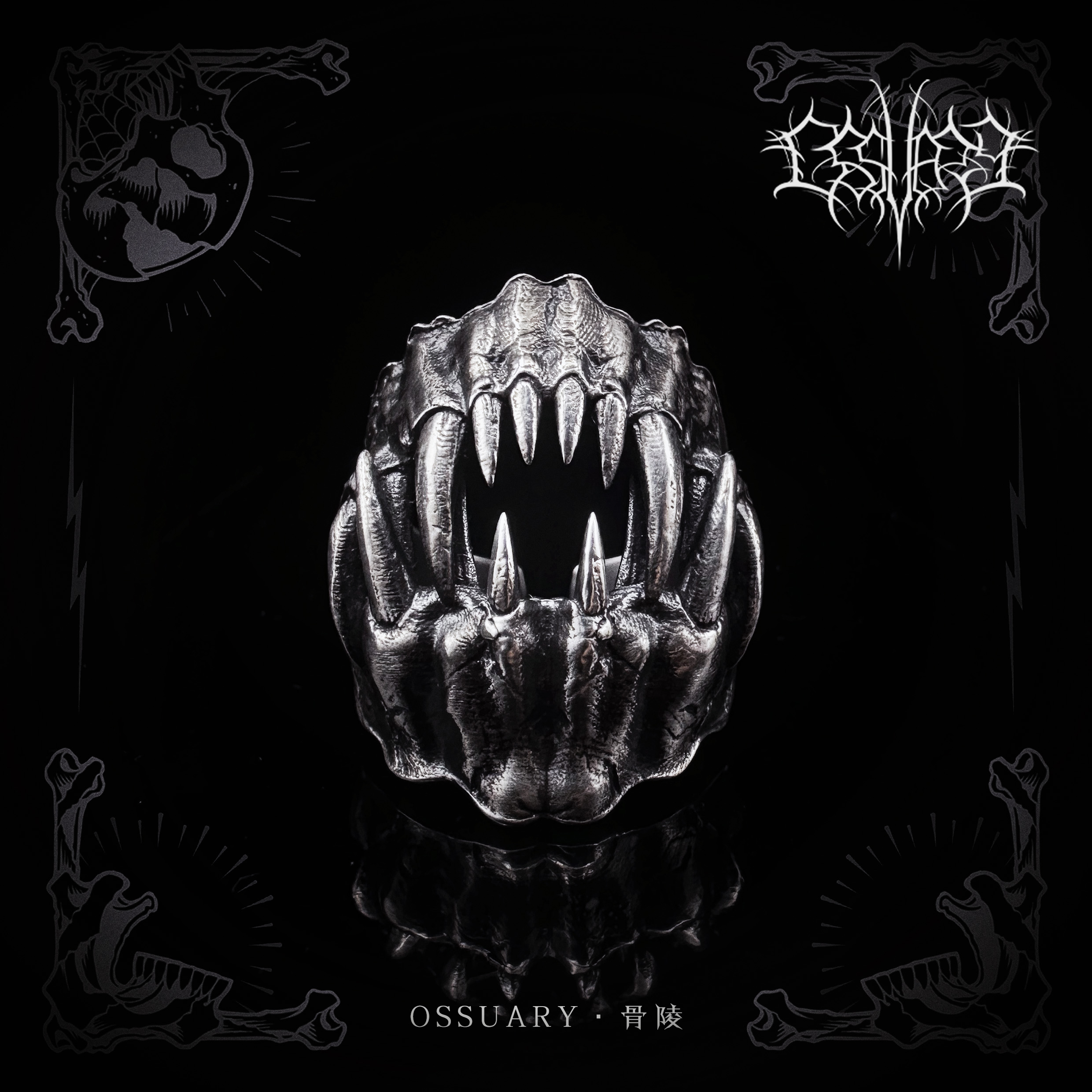 Ossuary "Beast" Dark Beast's Tooth Ring Sterling Silver Aged Fangs Shape Opening Ring Bone Mausoleum Original Design