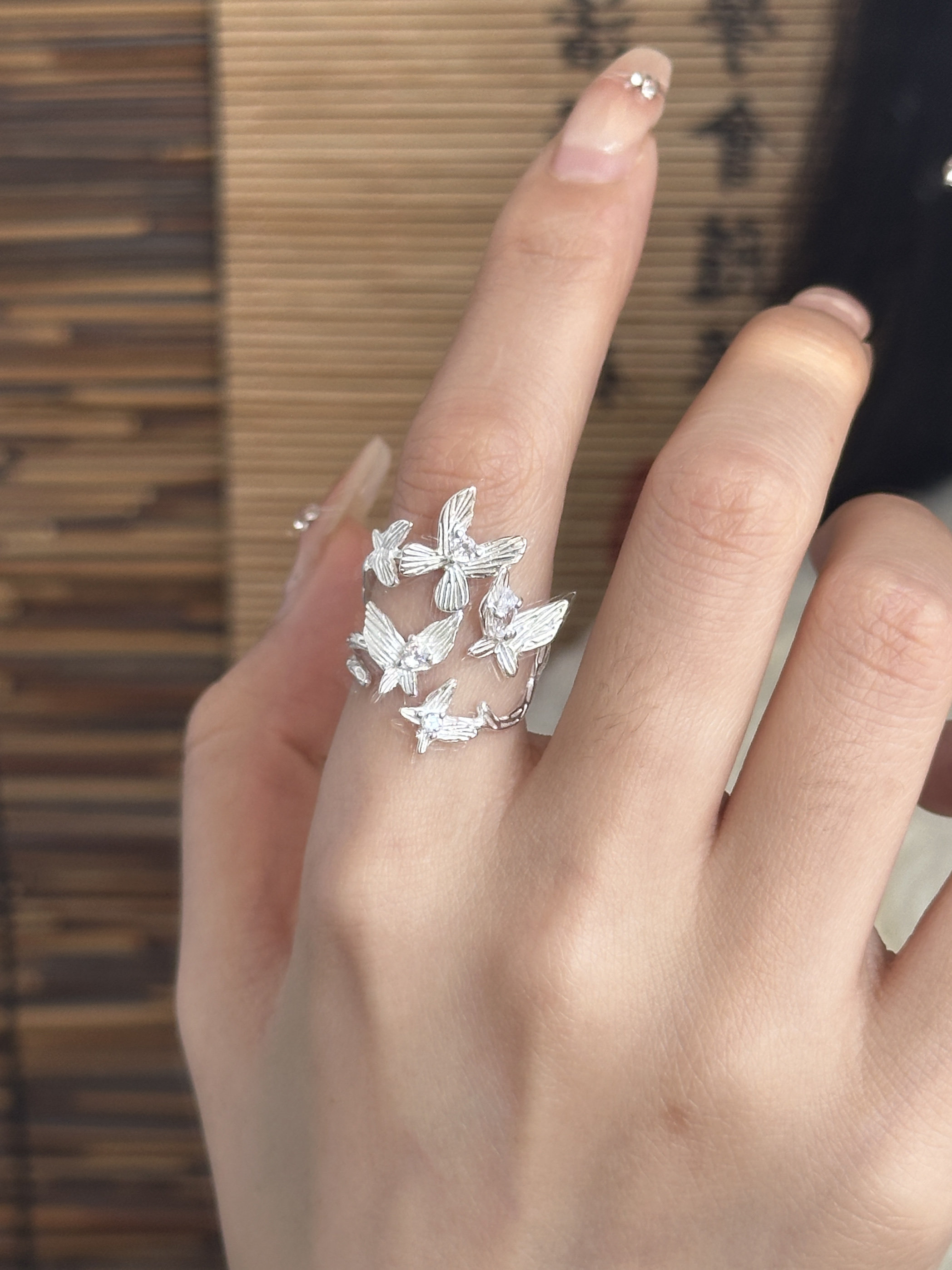 Xiyu "Fan Butterfly" pure silver 999.9 new Chinese sterling silver niche butterfly opening ring three-dimensional texture ring