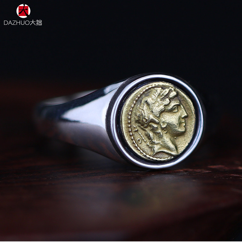 Big clumsy 18K small gold coin ancient greek silver coin ring vintage men's and women's closed ancient coin 925 sterling silver original design