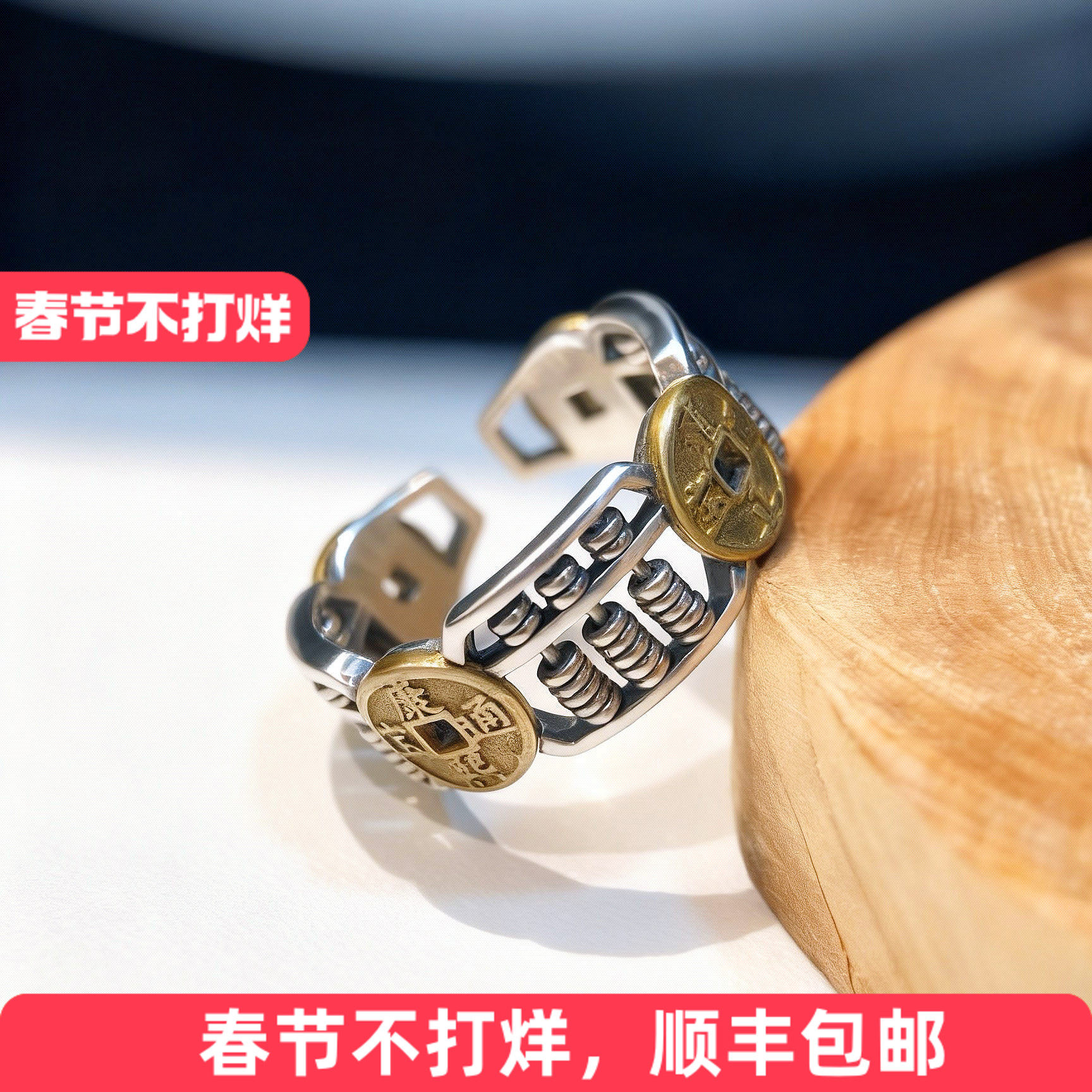 Sterling Silver S925 Copper Coin Abacus Ring Men's Women's Opening Adjustable Vintage Ethnic Style Index Finger Ring Gift