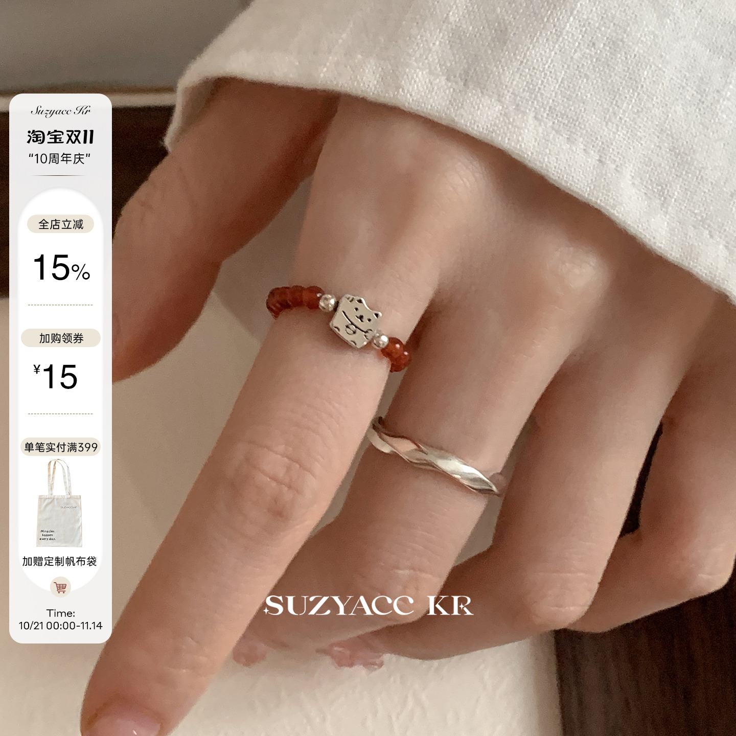 suzyacc kr red agate sterling silver beckoning cat ring Chinese vintage niche index ring versatile white ring