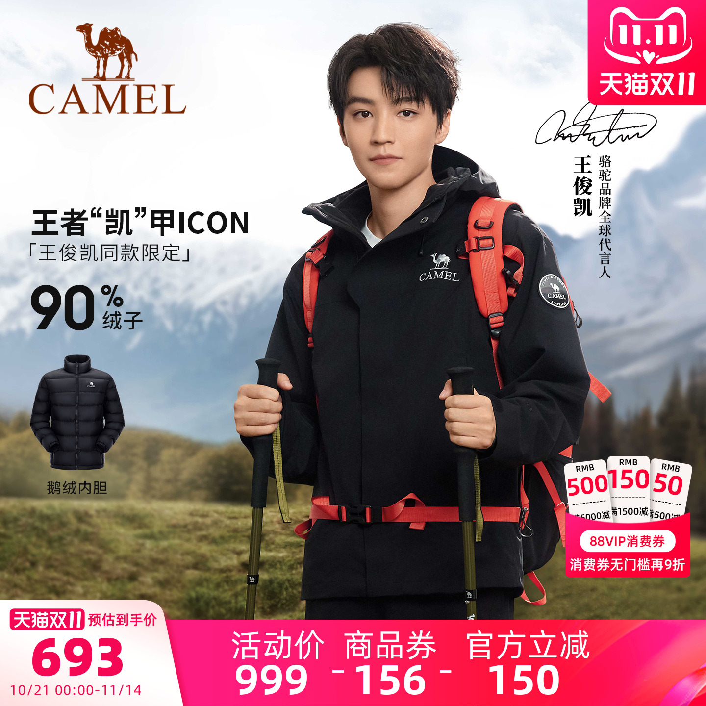 Camel jacket 3-in-1 down jacket King Kaijia ICON men's and women's new windproof waterproof goose down version jacket