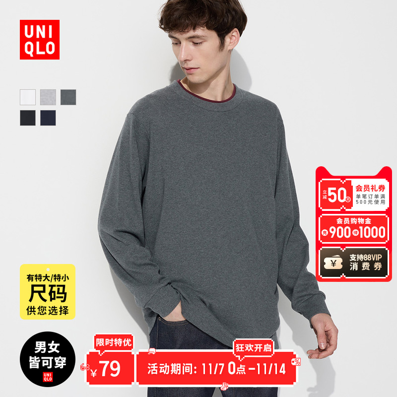 Uniqlo Men's and Women's Soft Crew Neck T-Shirt Long Sleeve Solid Color Pure Cotton Casual Top Bottom 469940 460319