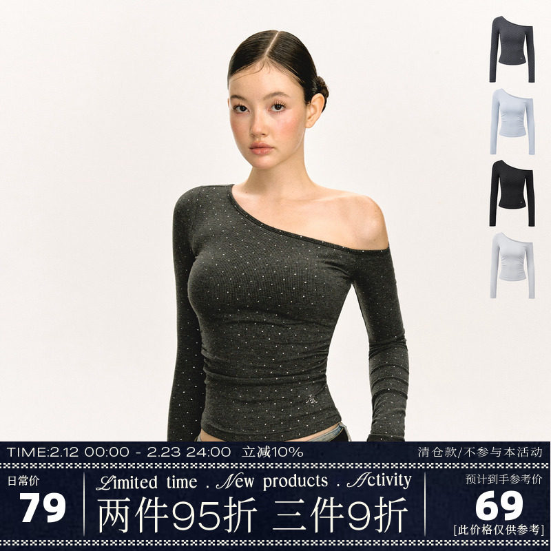 Ariseism American hot diamond off-the-shoulder long-sleeved T-shirt women's new hot girl base with a slim top underneath