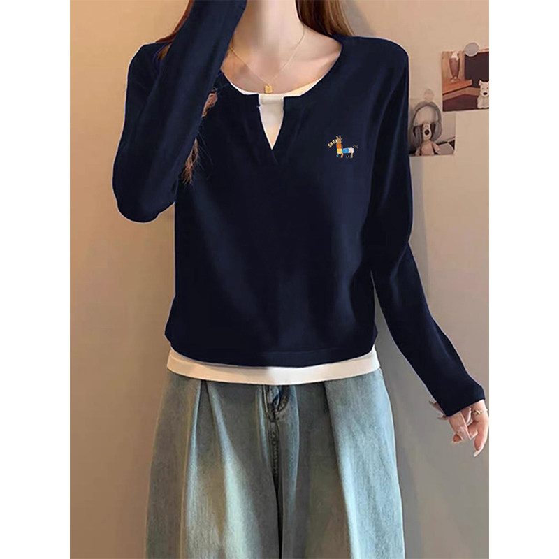 Fake two V-neck straight shoulder cotton long-sleeved T-shirts women's fashion and versatile navy blue base shirt tops spring and autumn winter