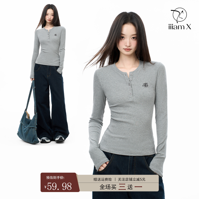 iiiamX gray V-neck plush slim T-shirt base shirt women's fall 2025 bottom long sleeves with a shoulder top