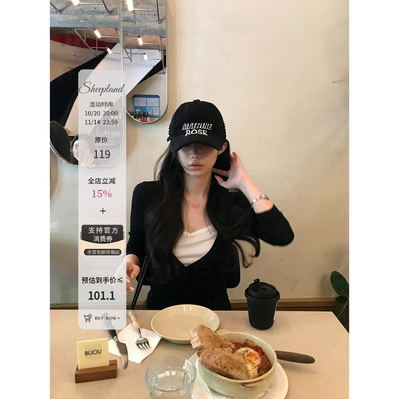 sheepland Seoul early autumn black V-neck fake two Tencel T-shirts for women autumn and winter slimming with bottom tops
