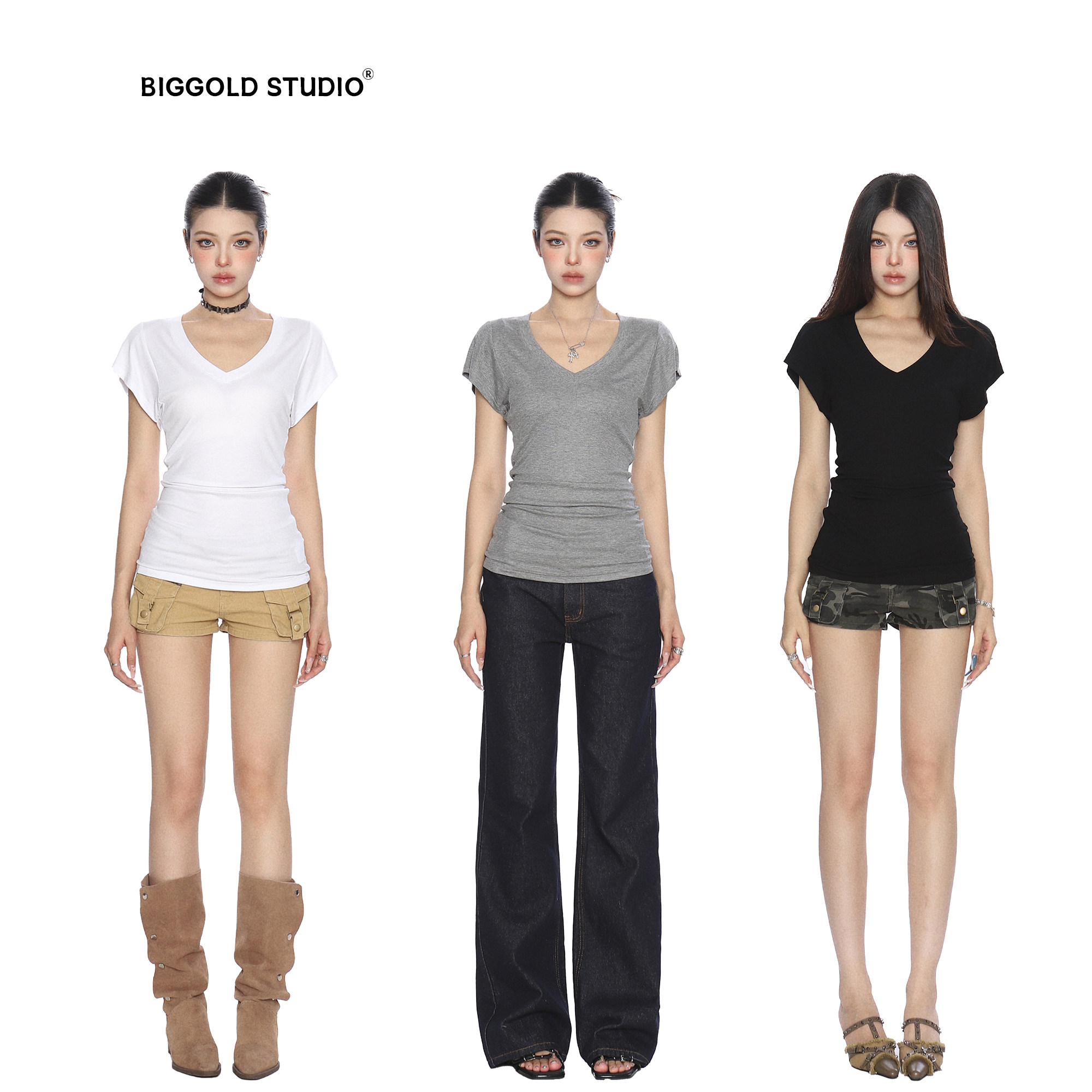 BIGGOLD Korean temperament V-neck straight shoulder short-sleeved T-shirt women's summer basic stacking sense slimming waist top