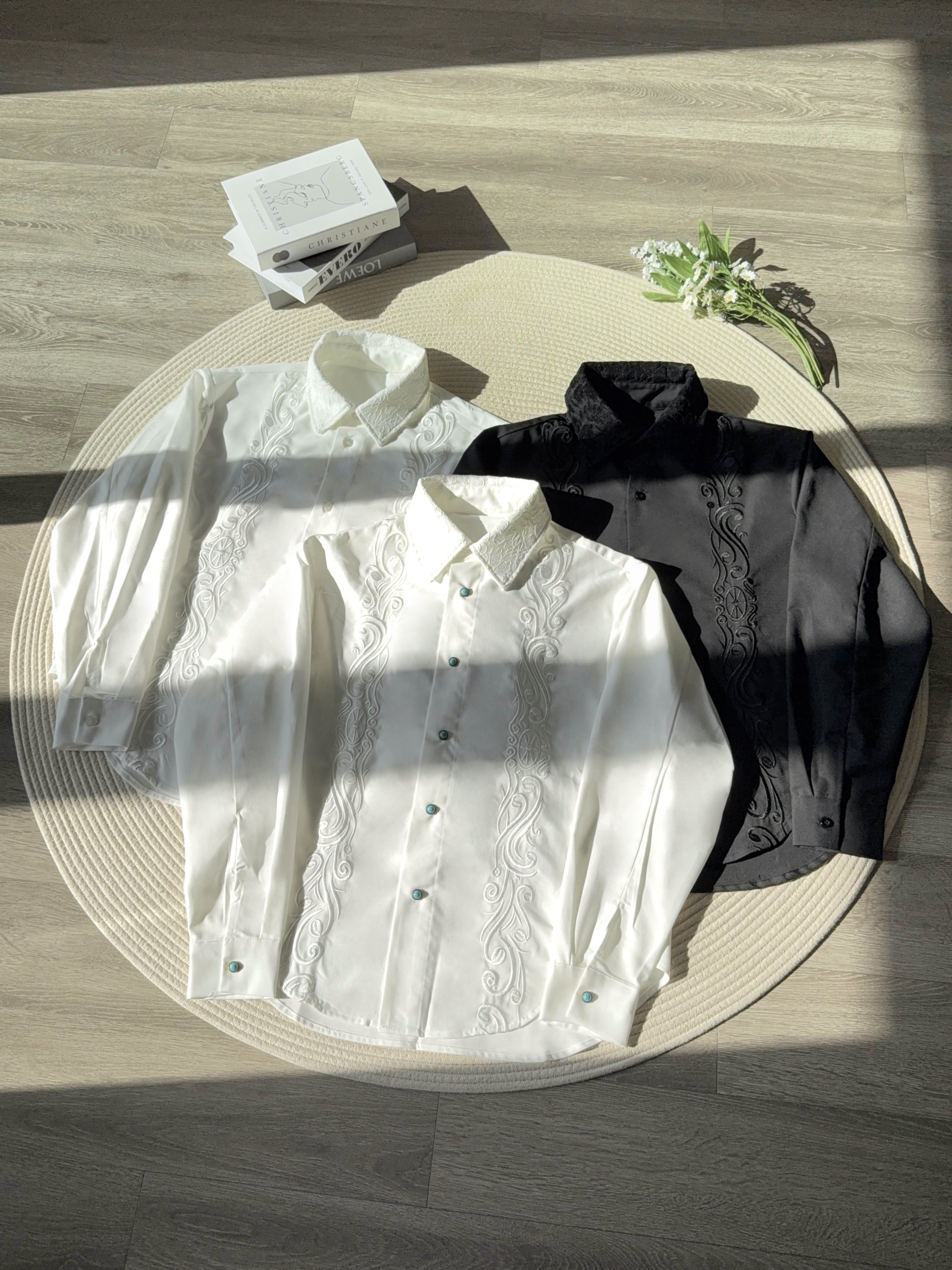 DESERTO embossed 10,000-needle preserved flower 45% linen blend embroidered floral collar long sleeve shirt casual shirt men