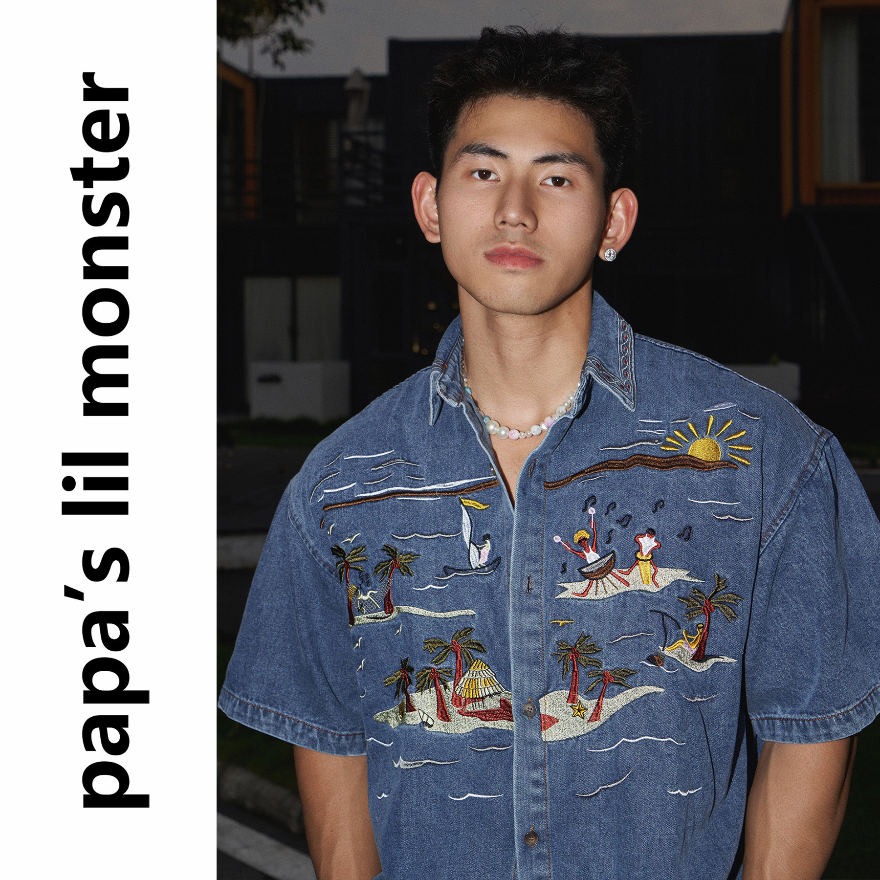 Lil Monster Summer New Embroidered Denim Short Sleeve Shirt Men's American Retro Street Sense Trendy Fashion
