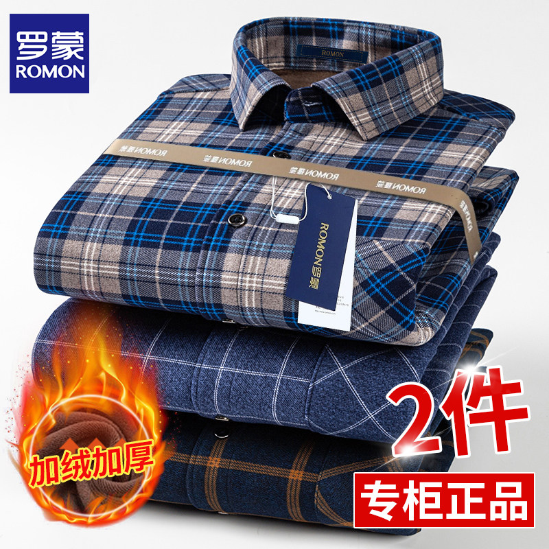 Romon fleece warm shirt men's long sleeve autumn and winter thickened plaid father shirt middle-aged and elderly dad top top