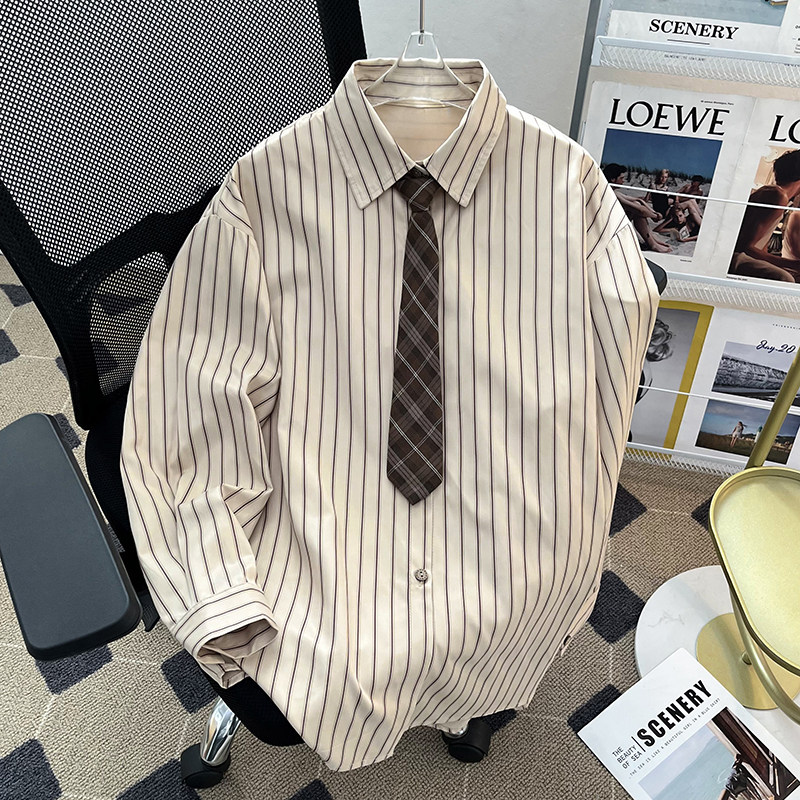 Japanese vintage striped shirt jacket men's loose ruffian handsome long sleeve shirt spring and autumn design sense tie top