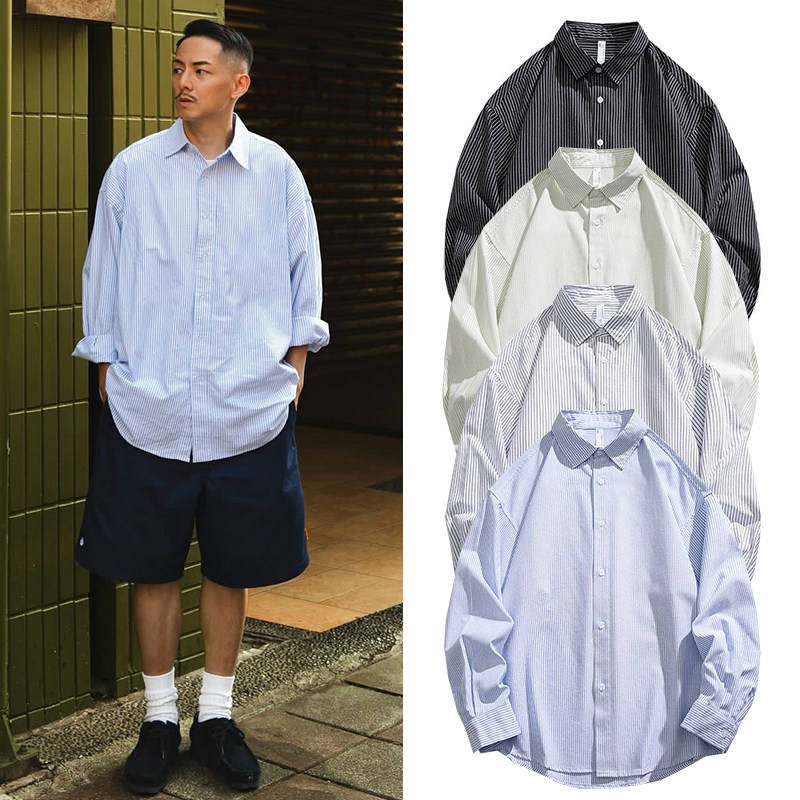 MIXHYHY Gray Japanese Vintage Vertical Stripe Long Sleeve Shirt Men's and Women's Collegiate Versatile Loose Shirt