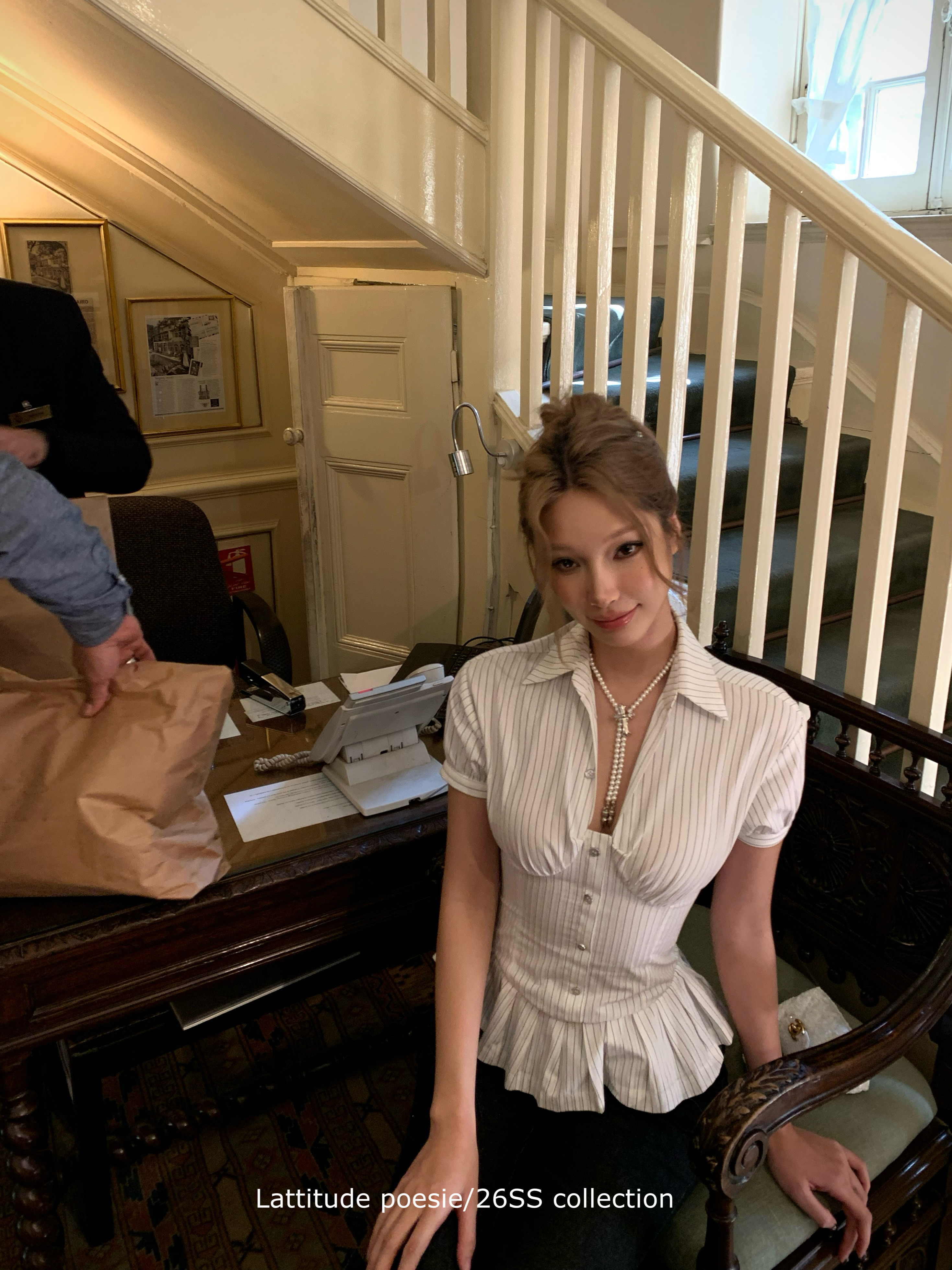 Lattitude/Yang Xiaolu Design sense striped waist short-sleeved top back strap preppy style shirt woman