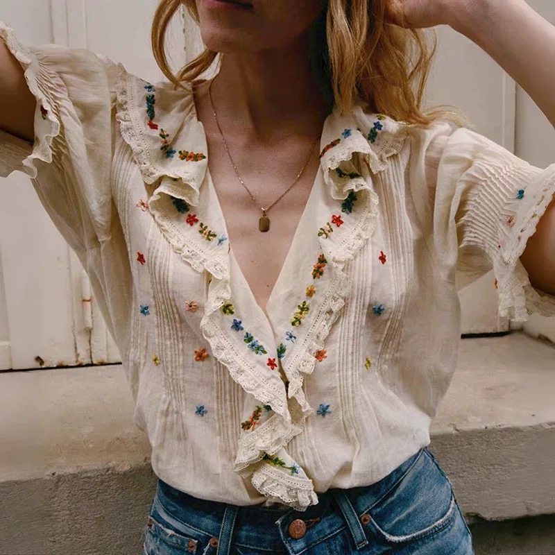 Ava's hand-embroidered pastoral shirt with French ruffled puff sleeve top