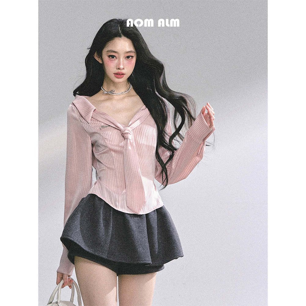 Aomalm Shaoya eye "Pink College" % high-end French polo collar striped shirt women's autumn sweet top