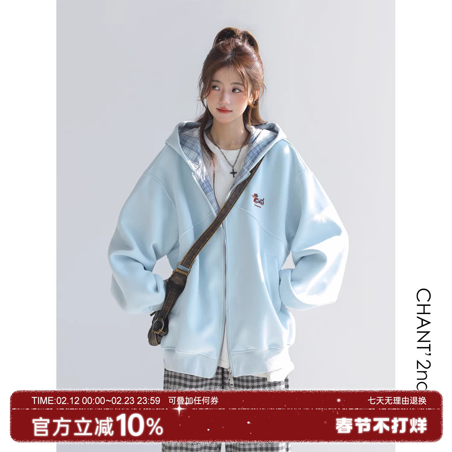 "CHANT2nd" Korean plaid patchwork dachshund embroidered jacket women's spring and autumn lazy loose sweatshirt cardigan