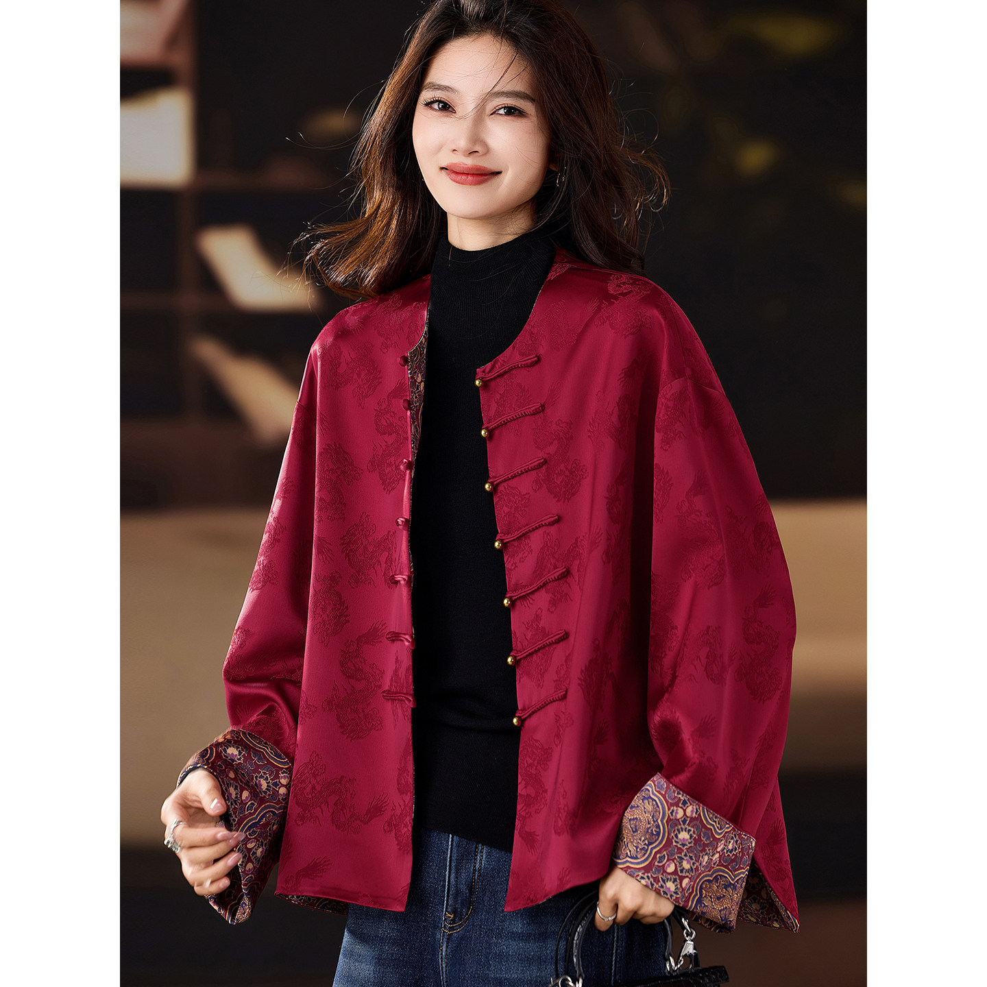 Plain wood vintage New Year's red jacquard patchwork jacket women's spring new new Chinese top 2026 plus size women's clothing
