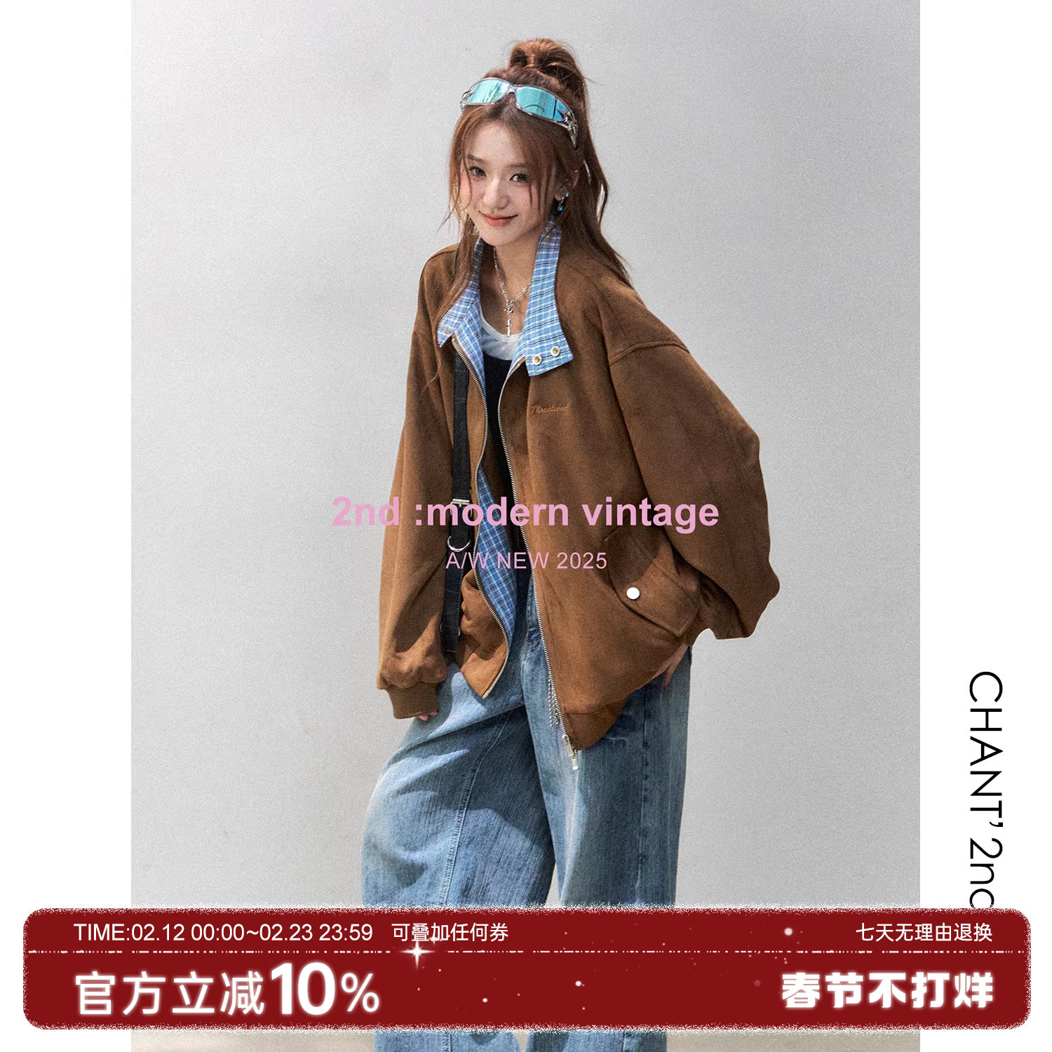 CHANT2nd star same plaid patchwork suede jacket women's 2026 spring baseball uniform casual jacket