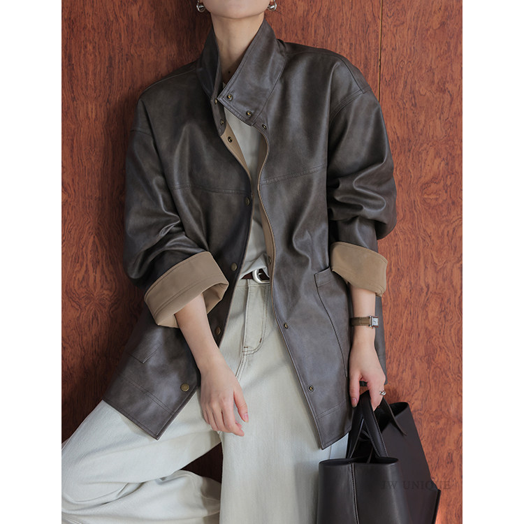 JWUNIQUE dimple coffee color single-breasted leather jacket for women in spring and autumn 2026