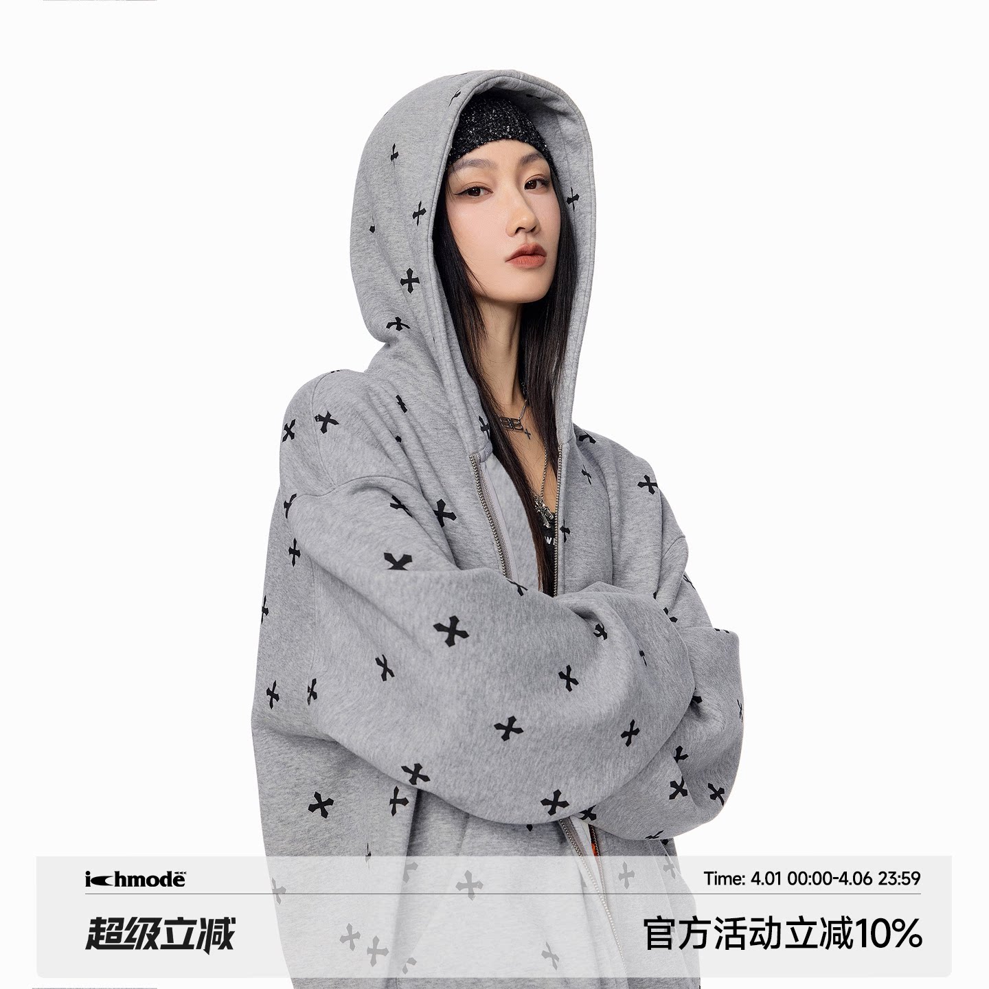 ICHMODE star cross full print gray sweatshirt jacket women's spring new loose cardigan top