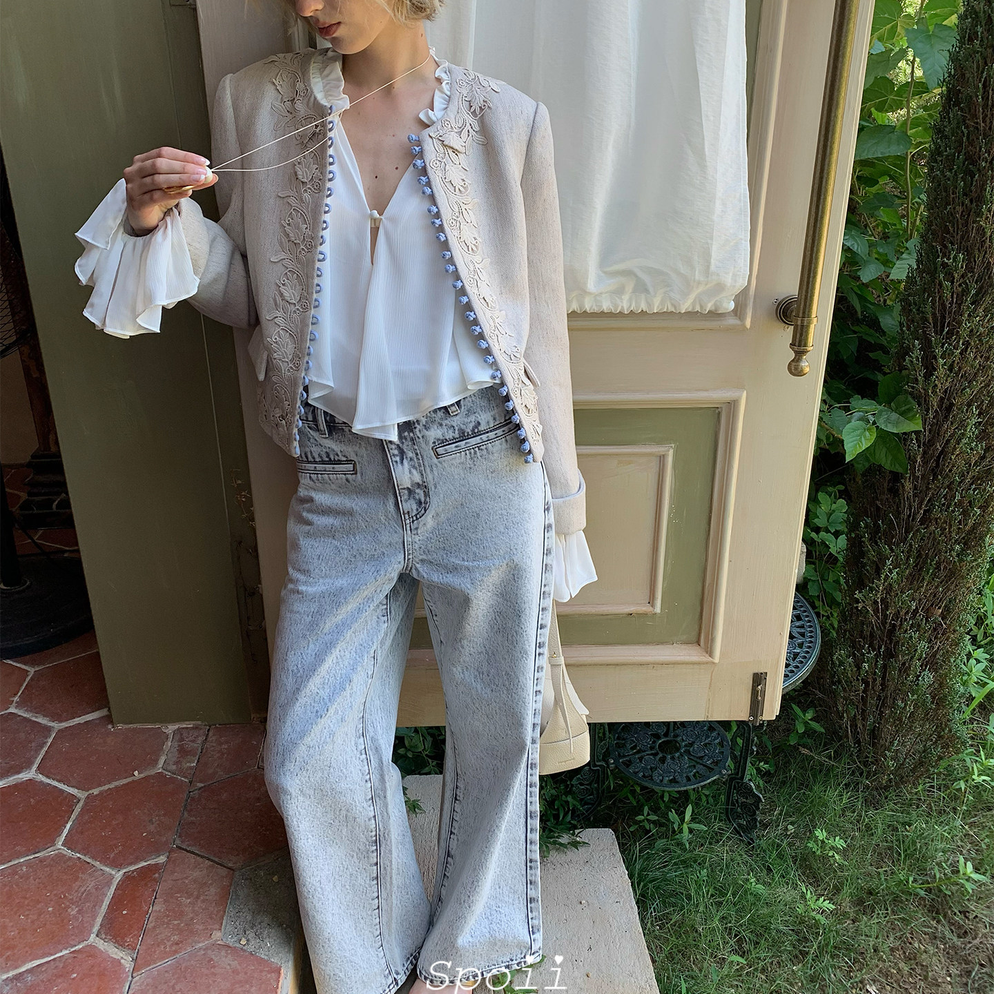 Spoii oatmeal French vintage court cuffed fly-sleeve heavy blue breasted jacket
