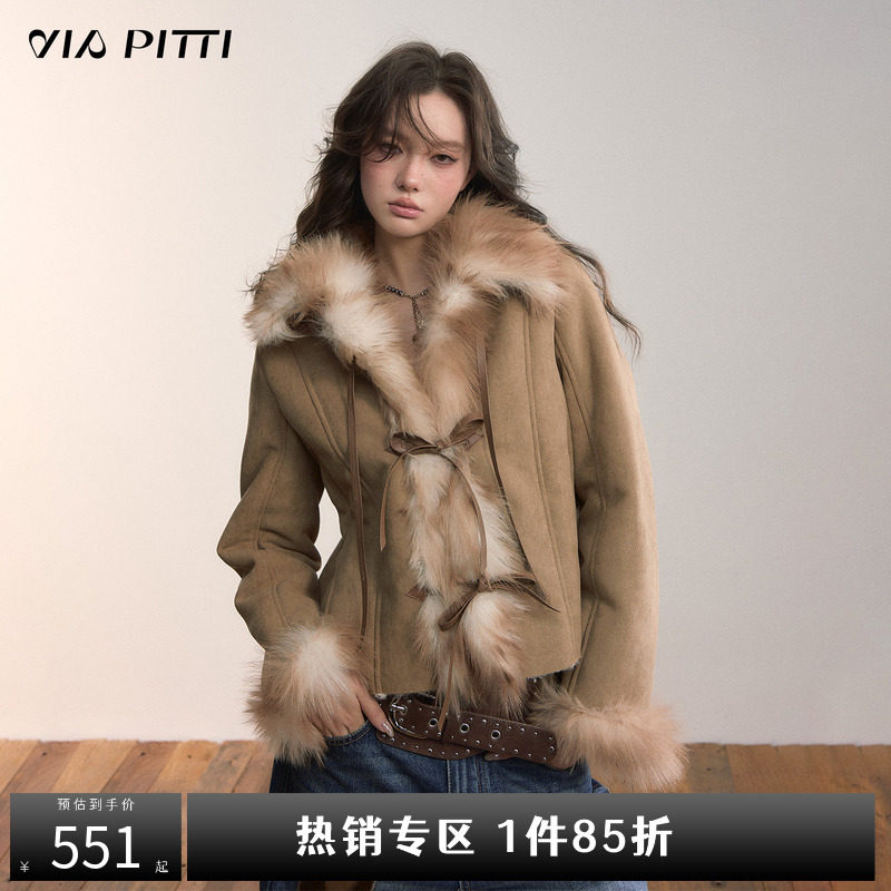 VIAPITTI design heavy bow strap imitation fur integrated jacket women's autumn and winter big fur collar top