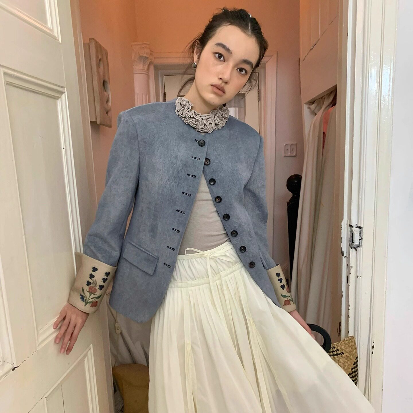 Spoii Blue Suede French Vintage Suit Padded Jacket/Off-White Pleated Design Skirt