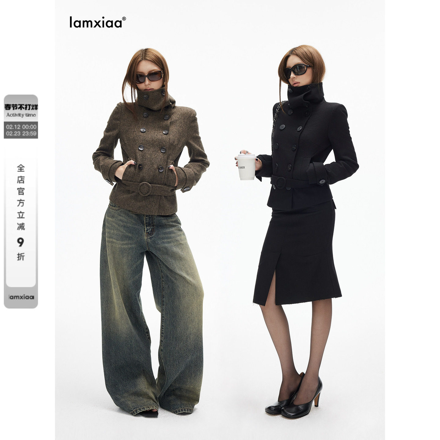iamxiaa* wool-blend large lapel multi-wear double-breasted waistband slightly loose short tweed jacket