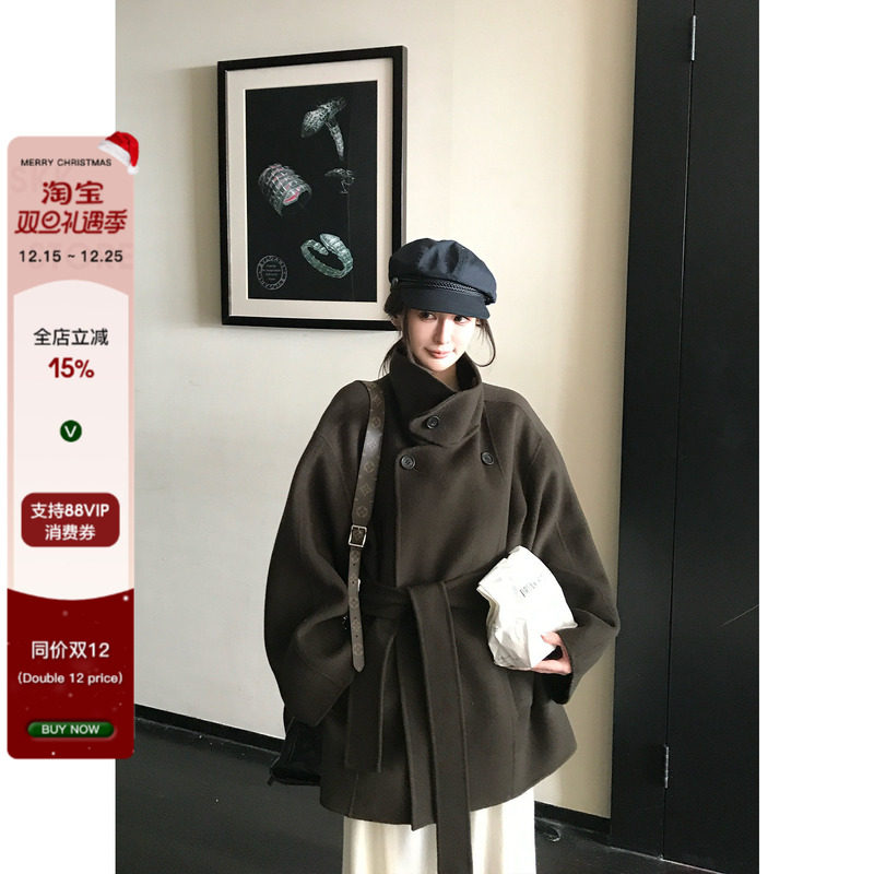 Brown reversible imitation cashmere stand-up collar woolen coat women's autumn and winter high-end temperament short thickened woolen coat