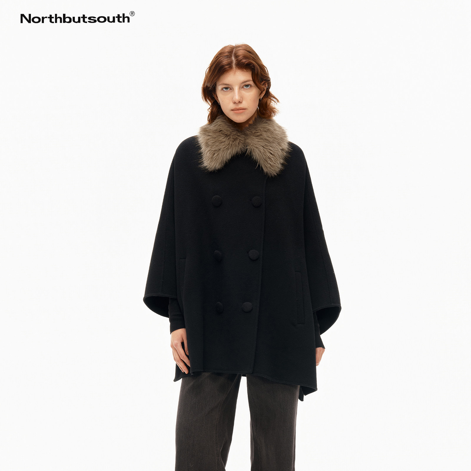 Northbutsouth Full Wool Double-Breasted Detachable Fur Collar Loose Cape Reversible Tweed Coat
