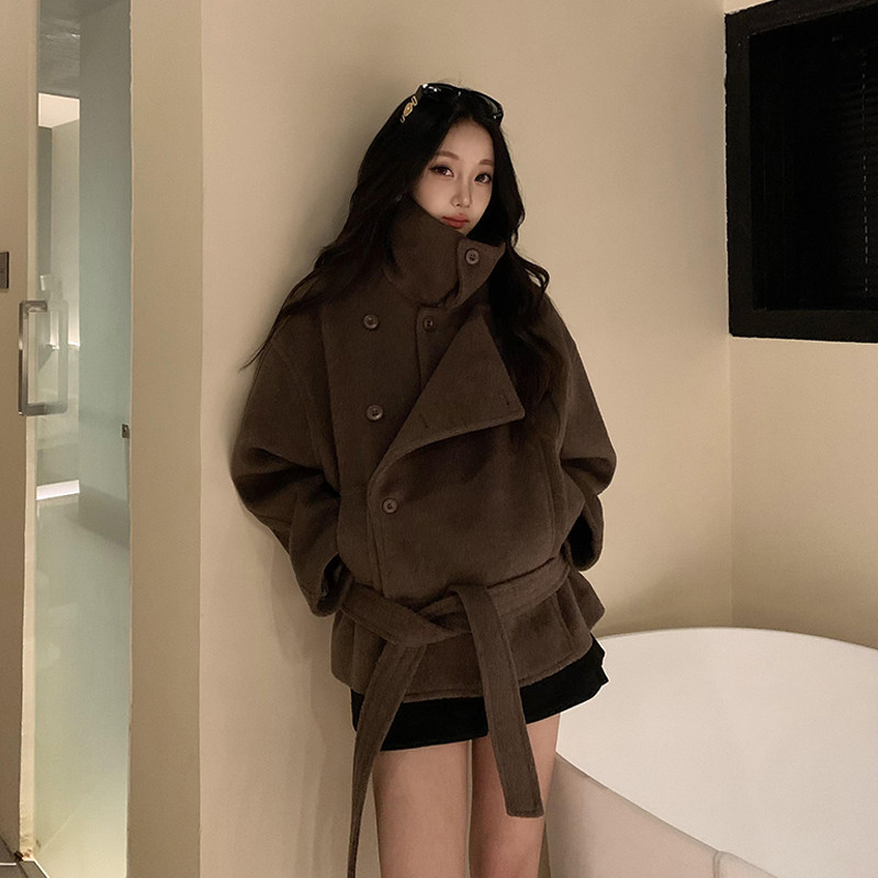 2025 Korean belt autumn and winter mocha brown new reversible cashmere woolen small jacket women's high-end coat
