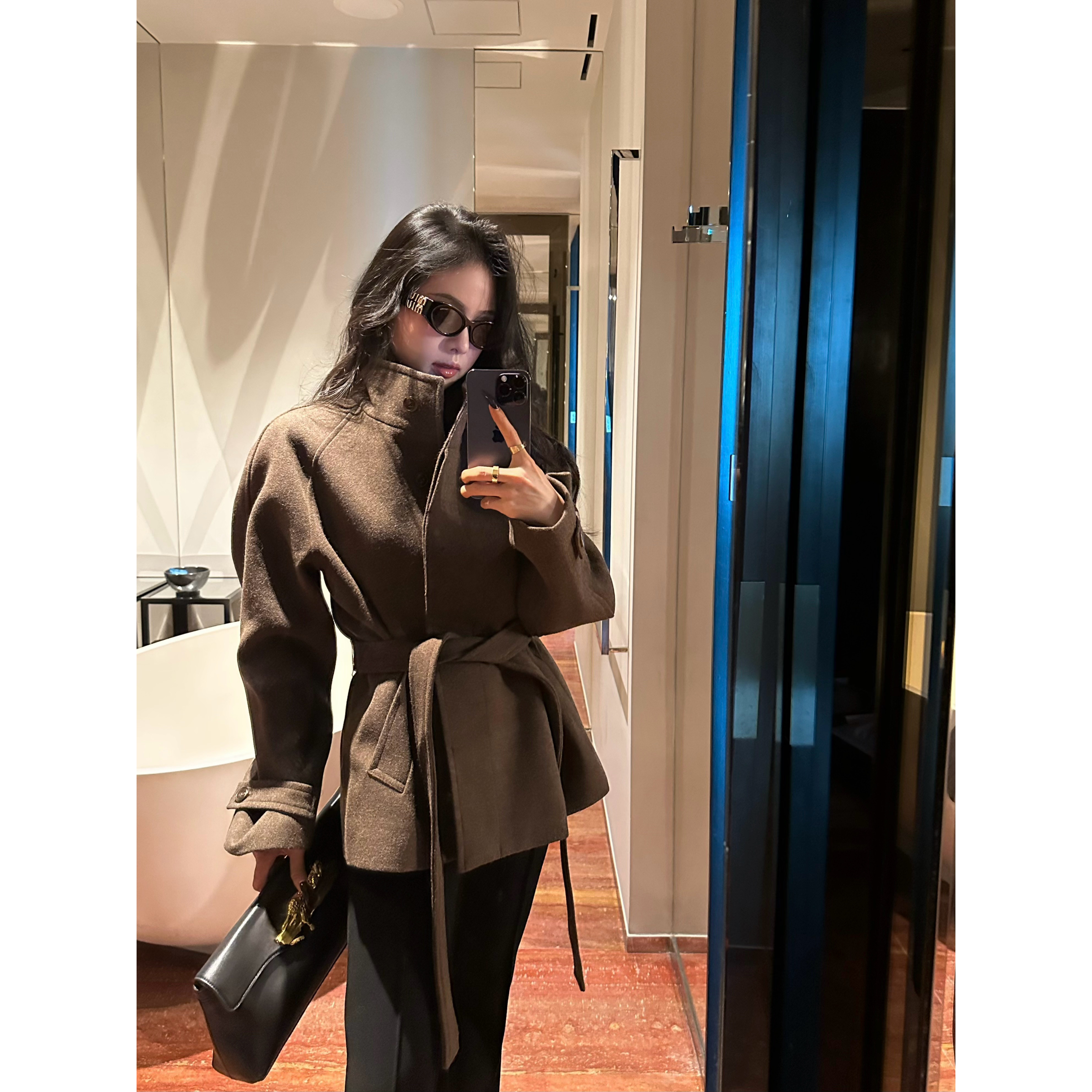 Luo Ge's wool roll autumn and winter waist woolen coat women's mid-length straight shoulder temperament stand-up collar woolen coat